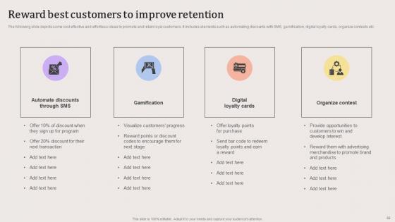 The following slide depicts some cost effective and effortless ideas to promote and retain loyal customers. It includes elements such as automating discounts with SMS, gamification, digital loyalty cards, organize contests etc.Are you searching for a Reward Best Customers To Improve Retention Evaluating Strengths And Weaknesses Ideas Pdf that is uncluttered, straightforward, and original Its easy to edit, and you can change the colors to suit your personal or business branding. For a presentation that expresses how much effort you have put in, this template is ideal. With all of its features, including tables, diagrams, statistics, and lists, its perfect for a business plan presentation. Make your ideas more appealing with these professional slides. Download Reward Best Customers To Improve Retention Evaluating Strengths And Weaknesses Ideas Pdf from Slidegeeks today. The following slide depicts some cost effective and effortless ideas to promote and retain loyal customers. It includes elements such as automating discounts with SMS, gamification, digital loyalty cards, organize contests etc.
