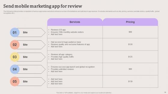 The following slide provides comparison of various app review website to enhance number of installations and optimize in app revenue. It includes elements such as site, pricing, services website visitors, quality traffic, global recognition etc.This Send Mobile Marketing App For Review Evaluating Strengths And Weaknesses Professional Pdf from Slidegeeks makes it easy to present information on your topic with precision. It provides customization options, so you can make changes to the colors, design, graphics, or any other component to create a unique layout. It is also available for immediate download, so you can begin using it right away. Slidegeeks has done good research to ensure that you have everything you need to make your presentation stand out. Make a name out there for a brilliant performance. The following slide provides comparison of various app review website to enhance number of installations and optimize in app revenue. It includes elements such as site, pricing, services website visitors, quality traffic, global recognition etc.