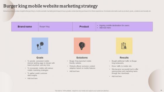 following slide provides insight to Burger Kings mobile website marketing technique to have greater understanding and learn from their experience. It includes elements such as product, goals, solutions and results etc.Presenting this PowerPoint presentation, titled Burger King Mobile Website Marketing Evaluating Strengths And Weaknesses Inspiration Pdf, with topics curated by our researchers after extensive research. This editable presentation is available for immediate download and provides attractive features when used. Download now and captivate your audience. Presenting this Burger King Mobile Website Marketing Evaluating Strengths And Weaknesses Inspiration Pdf. Our researchers have carefully researched and created these slides with all aspects taken into consideration. This is a completely customizable Burger King Mobile Website Marketing Evaluating Strengths And Weaknesses Inspiration Pdf that is available for immediate downloading. Download now and make an impact on your audience. Highlight the attractive features available with our PPTs. following slide provides insight to Burger Kings mobile website marketing technique to have greater understanding and learn from their experience. It includes elements such as product, goals, solutions and results etc.