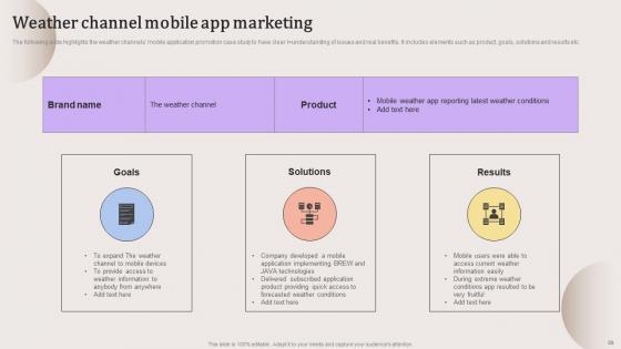 The following slide highlights the weather channels mobile application promotion case study to have clear I understanding of issues and real benefits. It includes elements such as product, goals, solutions and results etc.Slidegeeks is one of the best resources for PowerPoint templates. You can download easily and regulate Weather Channel Mobile App Marketing Evaluating Strengths And Weaknesses Portrait Pdf for your personal presentations from our wonderful collection. A few clicks is all it takes to discover and get the most relevant and appropriate templates. Use our Templates to add a unique zing and appeal to your presentation and meetings. All the slides are easy to edit and you can use them even for advertisement purposes. The following slide highlights the weather channels mobile application promotion case study to have clear i understanding of issues and real benefits. It includes elements such as product, goals, solutions and results etc.