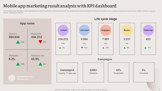 The following slide highlights mobile application promotions outcomes to optimize brand reach and assess new customers acquired. It includes elements such as sessions, responses, response rate, installs, activated, engaged, buyers, campaign results etc.Find highly impressive Mobile App Marketing Result Analysis Evaluating Strengths And Weaknesses Demonstration Pdf on Slidegeeks to deliver a meaningful presentation. You can save an ample amount of time using these presentation templates. No need to worry to prepare everything from scratch because Slidegeeks experts have already done a huge research and work for you. You need to download Mobile App Marketing Result Analysis Evaluating Strengths And Weaknesses Demonstration Pdf for your upcoming presentation. All the presentation templates are 100Precent editable and you can change the color and personalize the content accordingly. Download now. The following slide highlights mobile application promotions outcomes to optimize brand reach and assess new customers acquired. It includes elements such as sessions, responses, response rate, installs, activated, engaged, buyers, campaign results etc.