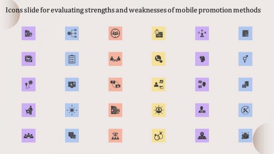 Download our innovative and attention grabbing Icons Slide For Evaluating Strengths And Weaknesses Of Mobile Promotion Methods Elements Pdf template. The set of slides exhibit completely customizable icons. These icons can be incorporated into any business presentation. So download it immediately to clearly communicate with your clientele. Our Icons Slide For Evaluating Strengths And Weaknesses Of Mobile Promotion Methods Elements Pdf are topically designed to provide an attractive backdrop to any subject. Use them to look like a presentation pro.