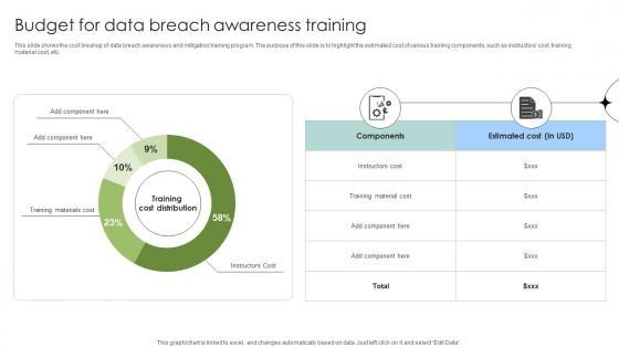 This slide shows the cost breakup of data breach awareness and mitigation training program. The purpose of this slide is to highlight the estimated cost of various training components, such as instructors cost, training material cost, etc.Get a simple yet stunning designed Budget For Data Breach Awareness Training Data Fortification Strengthening Defenses. It is the best one to establish the tone in your meetings. It is an excellent way to make your presentations highly effective. So, download this PPT today from Slidegeeks and see the positive impacts. Our easy-to-edit Budget For Data Breach Awareness Training Data Fortification Strengthening Defenses can be your go-to option for all upcoming conferences and meetings. So, what are you waiting for Grab this template today. This slide shows the cost breakup of data breach awareness and mitigation training program. The purpose of this slide is to highlight the estimated cost of various training components, such as instructors cost, training material cost, etc.