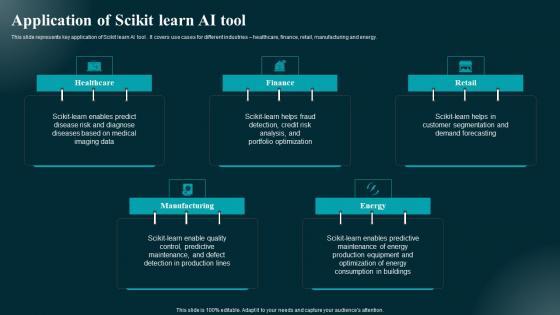 This slide represents key application of Scikit learn AI tool . It covers use cases for different industries healthcare, finance, retail, manufacturing and energy. Formulating a presentation can take up a lot of effort and time, so the content and message should always be the primary focus. The visuals of the PowerPoint can enhance the presenters message, so our Application Of Scikit Learn AI Tool Applications And Impact Structure Pdf was created to help save time. Instead of worrying about the design, the presenter can concentrate on the message while our designers work on creating the ideal templates for whatever situation is needed. Slidegeeks has experts for everything from amazing designs to valuable content, we have put everything into Application Of Scikit Learn AI Tool Applications And Impact Structure Pdf This slide represents key application of Scikit learn AI tool . It covers use cases for different industries healthcare, finance, retail, manufacturing and energy.