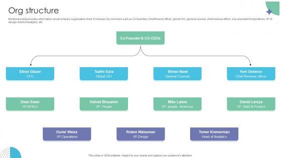 Mentioned slide provides information about company organization chart. It includes key members such as Co-founders, Chief finance officer, global CIO, general counsel, chief revenue officer, vice president of operations, VP of design, head of analytics, etc. Crafting an eye-catching presentation has never been more straightforward. Let your presentation shine with this tasteful yet straightforward Org Structure Workflow Management Investor Funding Elevator Pitch Deck template. It offers a minimalistic and classy look that is great for making a statement. The colors have been employed intelligently to add a bit of playfulness while still remaining professional. Construct the ideal Org Structure Workflow Management Investor Funding Elevator Pitch Deck that effortlessly grabs the attention of your audience Begin now and be certain to wow your customers Mentioned slide provides information about company organization chart. It includes key members such as Co-founders, Chief finance officer, global CIO, general counsel, chief revenue officer, vice president of operations, VP of design, head of analytics, etc.