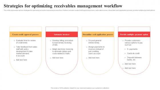 This slide represents various strategies for optimizing accounts receivable process flow. It further includes create credit approval process, automate invoices, streamline cash application process, provide multiple payment options Pitch your topic with ease and precision using this Strategies For Optimizing Receivables Management Workflow Structure Pdf. This layout presents information on Create Credit Approval Process, Automate Invoices, Streamline Cash Application Process. It is also available for immediate download and adjustment. So, changes can be made in the color, design, graphics or any other component to create a unique layout. This slide represents various strategies for optimizing accounts receivable process flow. It further includes create credit approval process, automate invoices, streamline cash application process, provide multiple payment options