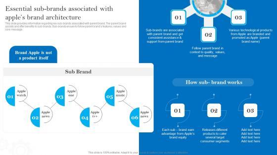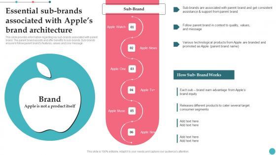 This slide provides information regarding key sub brands associated with parent brand. The parent brand assists and offer benefits to sub-brands. Sub brands ensure to follow parent brands features, values and core message. From laying roadmaps to briefing everything in detail, our templates are perfect for you. You can set the stage with your presentation slides. All you have to do is download these easy to edit and customizable templates. Essential Sub Brands Associated With Apples Brand Architecture Sample PDF will help you deliver an outstanding performance that everyone would remember and praise you for. Do download this presentation today.