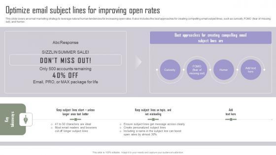 This slide covers an email marketing strategy to leverage natural human tendencies for increasing open rates. It also includes the best approaches for creating compelling email subject lines, such as curiosity, FOMO fear of missing out, and humor. Crafting an eye-catching presentation has never been more straightforward. Let your presentation shine with this tasteful yet straightforward Optimize Email Subject Lines For Improving Open Rates Strategies For Acquiring Consumers Slides PDF template. It offers a minimalistic and classy look that is great for making a statement. The colors have been employed intelligently to add a bit of playfulness while still remaining professional. Construct the ideal Optimize Email Subject Lines For Improving Open Rates Strategies For Acquiring Consumers Slides PDF that effortlessly grabs the attention of your audience Begin now and be certain to wow your customers.