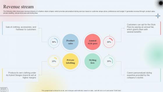 The following slide showcases revenue streams of a fashion retail company which provides personalized styling services based on customer unique styles, preferences and budget. It generates revenue through product sales, private labelling, annual style pass and styling fees. This modern and well arranged Revenue Stream Clothing Subscription Platform Investor Funding Elevator Pitch Deck PPT Template provides lots of creative possibilities. It is very simple to customize and edit with the Powerpoint Software. Just drag and drop your pictures into the shapes. All facets of this template can be edited with Powerpoint, no extra software is necessary. Add your own material, put your images in the places assigned for them, adjust the colors, and then you can show your slides to the world, with an animated slide included. The following slide showcases revenue streams of a fashion retail company which provides personalized styling services based on customer unique styles, preferences and budget. It generates revenue through product sales, private labelling, annual style pass and styling fees.