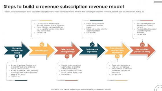 This slide shows detailed steps to design a successful subscription revenue model in terms of profitability. It include steps such as figure out benefits from model, establish goals and select suitable strategy, etc. This modern and well-arranged Steps To Build A Revenue Subscription Internet Based Trade Structure Ppt Template provides lots of creative possibilities. It is very simple to customize and edit with the Powerpoint Software. Just drag and drop your pictures into the shapes. All facets of this template can be edited with Powerpoint, no extra software is necessary. Add your own material, put your images in the places assigned for them, adjust the colors, and then you can show your slides to the world, with an animated slide included. This slide shows detailed steps to design a successful subscription revenue model in terms of profitability. It include steps such as figure out benefits from model, establish goals and select suitable strategy, etc.