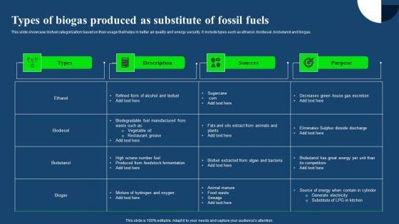 This slide showcase biofuel categorization based on their usage that helps in better air quality and energy security. It include types such as ethanol, biodiesel ,biobutanol and biogas. Showcasing this set of slides titled Types Of Biogas Produced As Substitute Of Fossil Fuels Guidelines PDF. The topics addressed in these templates are Sugarcane, Corn, Vegetable Oil. All the content presented in this PPT design is completely editable. Download it and make adjustments in color, background, font etc. as per your unique business setting.