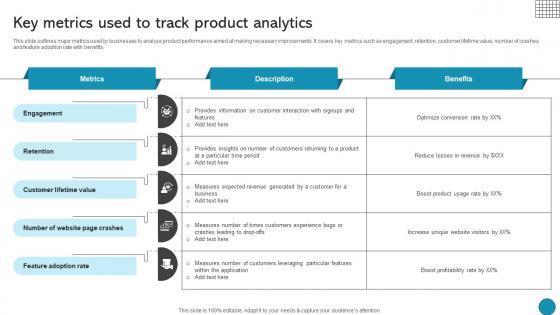 This slide outlines major metrics used by businesses to analyse product performance aimed at making necessary improvements. It covers key metrics such as engagement, retention, customer lifetime value, number of crashes and feature adoption rate with benefits Find a pre-designed and impeccable Key Metrics Used To Track Product Analytics Driving Business Success Integrating Product. The templates can ace your presentation without additional effort. You can download these easy-to-edit presentation templates to make your presentation stand out from others. So, what are you waiting for Download the template from Slidegeeks today and give a unique touch to your presentation. This slide outlines major metrics used by businesses to analyse product performance aimed at making necessary improvements. It covers key metrics such as engagement, retention, customer lifetime value, number of crashes and feature adoption rate with benefits