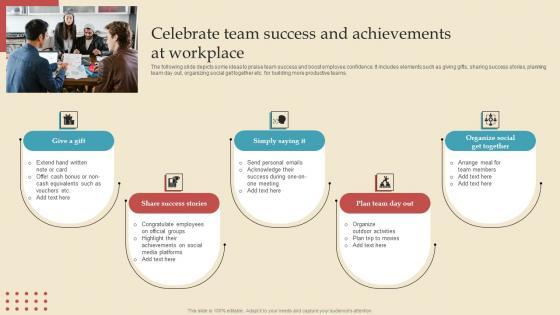 The following slide depicts some ideas to praise team success and boost employee confidence. It includes elements such as giving gifts, sharing success stories, planning team day out, organizing social get together etc. for building more productive teams. The best PPT templates are a great way to save time, energy, and resources. Slidegeeks have 100 percent editable powerpoint slides making them incredibly versatile. With these quality presentation templates, you can create a captivating and memorable presentation by combining visually appealing slides and effectively communicating your message. Download Celebrate Team Success Describing Business Performance Administration Goals Pictures Pdf from Slidegeeks and deliver a wonderful presentation. The following slide depicts some ideas to praise team success and boost employee confidence. It includes elements such as giving gifts, sharing success stories, planning team day out, organizing social get together etc. for building more productive teams.