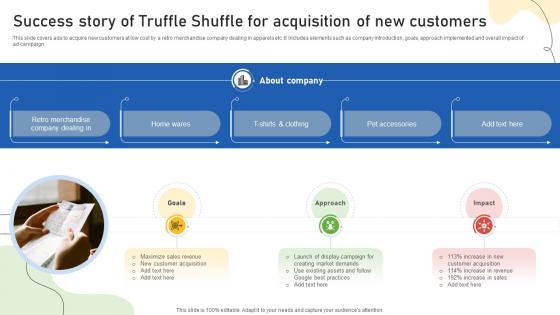 This slide covers ads to acquire new customers at low cost by a retro merchandise company dealing in apparels etc .It includes elements such as company introduction, goals, approach implemented and overall impact of ad campaign. Are you searching for a Google Ads Categories Success Story Of Truffle Shuffle For Acquisition Of New Customers MKT SS V that is uncluttered, straightforward, and original Its easy to edit, and you can change the colors to suit your personal or business branding. For a presentation that expresses how much effort you have put in, this template is ideal With all of its features, including tables, diagrams, statistics, and lists, its perfect for a business plan presentation. Make your ideas more appealing with these professional slides. Download Google Ads Categories Success Story Of Truffle Shuffle For Acquisition Of New Customers MKT SS V from Slidegeeks today. This slide covers ads to acquire new customers at low cost by a retro merchandise company dealing in apparels etc .It includes elements such as company introduction, goals, approach implemented and overall impact of ad campaign.