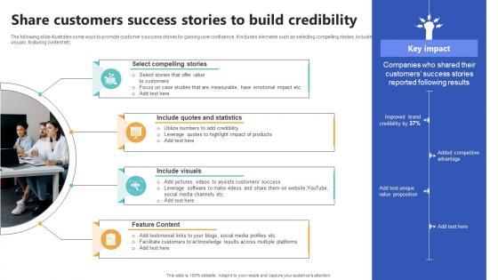 The following slide illustrates some ways to promote customers success stories for gaining user confidence. It includes elements such as selecting compelling stories, including quotes, statistics, visuals, featuring content etc.From laying roadmaps to briefing everything in detail, our templates are perfect for you. You can set the stage with your presentation slides. All you have to do is download these easy-to-edit and customizable templates. Share Customers Success Stories To Build Credibility Comprehensive Guide To Implement Strategy SS V will help you deliver an outstanding performance that everyone would remember and praise you for. Do download this presentation today. The following slide illustrates some ways to promote customers success stories for gaining user confidence. It includes elements such as selecting compelling stories, including quotes, statistics, visuals, featuring content etc.