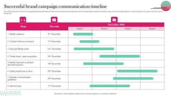 This slide consists of a brand messaging development timeline to determine the brand value proposition and communication channels. It includes steps such as identify audience, conduct reference research, discover market trends, etc. Showcasing this set of slides titled Successful Brand Campaign Communication Timeline Topics PDF. The topics addressed in these templates are Identify Audience, Conduct Reference Research, Discover Market Trend, Create Brand Value Proposition. All the content presented in this PPT design is completely editable. Download it and make adjustments in color, background, font etc. as per your unique business setting.