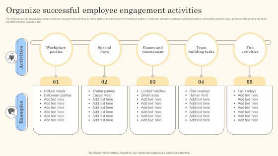 The following slide showcases some employee engagement activities to relive staff stress and improve workplace culture. It includes elements such as workplace parties, celebrating special days, games and tournaments, team building and fun activities etc. The best PPT templates are a great way to save time, energy, and resources. Slidegeeks have 100 percent editable powerpoint slides making them incredibly versatile. With these quality presentation templates, you can create a captivating and memorable presentation by combining visually appealing slides and effectively communicating your message. Download Organize Successful Employee Engagement Activities Ppt File Elements PDF from Slidegeeks and deliver a wonderful presentation.