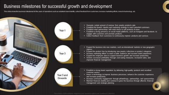 This slide shows the business milestones for five years of operations such as establish brand identity, collect feedback from customers, increase marketing efforts, invest in technology, etc. Are you in need of a template that can accommodate all of your creative concepts This one is crafted professionally and can be altered to fit any style. Use it with Google Slides or PowerPoint. Include striking photographs, symbols, depictions, and other visuals. Fill, move around, or remove text boxes as desired. Test out color palettes and font mixtures. Edit and save your work, or work with colleagues. Download Business Milestones For Successful Growth And Development Jewelry Business Plan Portrait Pdf and observe how to make your presentation outstanding. Give an impeccable presentation to your group and make your presentation unforgettable. This slide shows the business milestones for five years of operations such as establish brand identity, collect feedback from customers, increase marketing efforts, invest in technology, etc.
