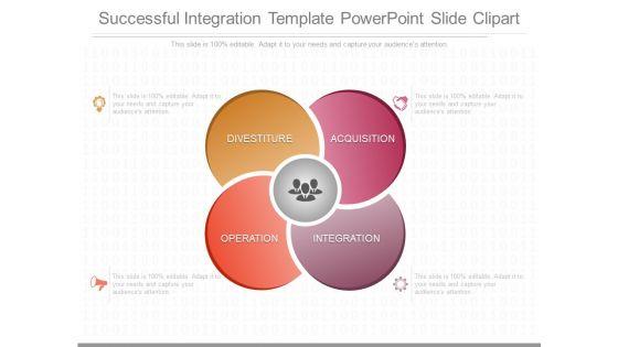 This is a successful integration template powerpoint slide clipart. This is a four stage process. The stages in this process are divestiture, acquisition, integration, operation.