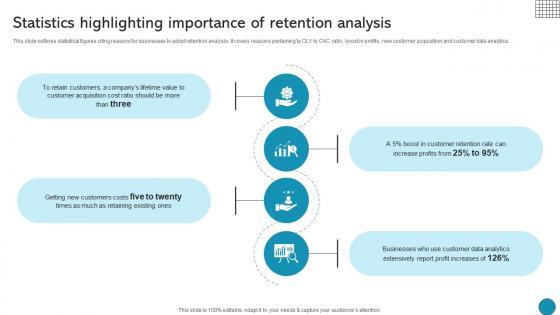 This slide outlines statistical figures citing reasons for businesses to adopt retention analysis. It covers reasons pertaining to CLV to CAC ratio, boost in profits, new customer acquisition and customer data analyticsCrafting an eye-catching presentation has never been more straightforward. Let your presentation shine with this tasteful yet straightforward Statistics Highlighting Importance Of Retention Analysis Driving Business Success Integrating Product template. It offers a minimalistic and classy look that is great for making a statement. The colors have been employed intelligently to add a bit of playfulness while still remaining professional. Construct the ideal Statistics Highlighting Importance Of Retention Analysis Driving Business Success Integrating Product that effortlessly grabs the attention of your audience Begin now and be certain to wow your customers This slide outlines statistical figures citing reasons for businesses to adopt retention analysis. It covers reasons pertaining to CLV to CAC ratio, boost in profits, new customer acquisition and customer data analytics