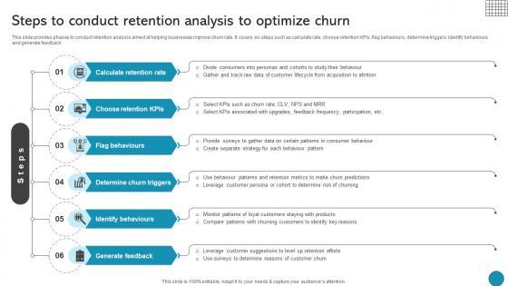 This slide provides phases to conduct retention analysis aimed at helping businesses improve churn rate. It covers six steps such as calculate rate, choose retention KPIs, flag behaviours, determine triggers, identify behaviours and generate feedback Welcome to our selection of the Steps To Conduct Retention Analysis To Optimize Churn Driving Business Success Integrating Product. These are designed to help you showcase your creativity and bring your sphere to life. Planning and Innovation are essential for any business that is just starting out. This collection contains the designs that you need for your everyday presentations. All of our PowerPoints are 100 percent editable, so you can customize them to suit your needs. This multi-purpose template can be used in various situations. Grab these presentation templates today. This slide provides phases to conduct retention analysis aimed at helping businesses improve churn rate. It covers six steps such as calculate rate, choose retention KPIs, flag behaviours, determine triggers, identify behaviours and generate feedback
