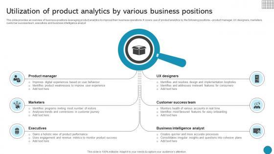This slide provides an overview of business positions leveraging product analytics to improve their business operations. It covers use of product analytics by the following positions product manager, UX designers, marketers, customer success team, executives and business intelligence analyst Presenting this PowerPoint presentation, titled Utilization Of Product Analytics By Various Business Positions Driving Business Success Integrating Product, with topics curated by our researchers after extensive research. This editable presentation is available for immediate download and provides attractive features when used. Download now and captivate your audience. Presenting this Utilization Of Product Analytics By Various Business Positions Driving Business Success Integrating Product. Our researchers have carefully researched and created these slides with all aspects taken into consideration. This is a completely customizable Utilization Of Product Analytics By Various Business Positions Driving Business Success Integrating Product that is available for immediate downloading. Download now and make an impact on your audience. Highlight the attractive features available with our PPTs. This slide provides an overview of business positions leveraging product analytics to improve their business operations. It covers use of product analytics by the following positions product manager, UX designers, marketers, customer success team, executives and business intelligence analyst