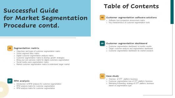 Create an editable Table Of Contents Successful Guide For Market Segmentation Procedure Introduction Pdf that communicates your idea and engages your audience. Whether you are presenting a business or an educational presentation, pre-designed presentation templates help save time. Table Of Contents Successful Guide For Market Segmentation Procedure Introduction Pdf is highly customizable and very easy to edit, covering many different styles from creative to business presentations. Slidegeeks has creative team members who have crafted amazing templates. So, go and get them without any delay. Our Table Of Contents Successful Guide For Market Segmentation Procedure Introduction Pdf are topically designed to provide an attractive backdrop to any subject. Use them to look like a presentation pro.