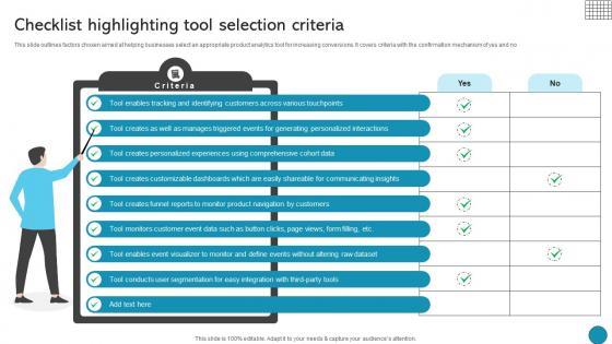 This slide outlines factors chosen aimed at helping businesses select an appropriate product analytics tool for increasing conversions. It covers criteria with the confirmation mechanism of yes and no Do you have an important presentation coming up Are you looking for something that will make your presentation stand out from the rest Look no further than Checklist Highlighting Tool Selection Criteria Driving Business Success Integrating Product. With our professional designs, you can trust that your presentation will pop and make delivering it a smooth process. And with Slidegeeks, you can trust that your presentation will be unique and memorable. So why wait Grab Checklist Highlighting Tool Selection Criteria Driving Business Success Integrating Product today and make your presentation stand out from the rest This slide outlines factors chosen aimed at helping businesses select an appropriate product analytics tool for increasing conversions. It covers criteria with the confirmation mechanism of yes and no