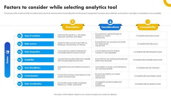 The purpose of the mentioned slide is to outline various factors to examine before incorporating them into the project management. It includes various attributes such as factors, description, considerations, and compatibility. If your project calls for a presentation, then Slidegeeks is your go-to partner because we have professionally designed, easy-to-edit templates that are perfect for any presentation. After downloading, you can easily edit Factors To Consider While Selecting Analytics Tool Strategies For Success In Digital and make the changes accordingly. You can rearrange slides or fill them with different images. Check out all the handy templates The purpose of the mentioned slide is to outline various factors to examine before incorporating them into the project management. It includes various attributes such as factors, description, considerations, and compatibility.