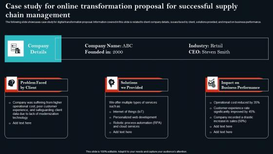 The following slide showcases case study for digital transformation proposal. Information covered in this slide is related to client company details, issues faced by client, solutions provided, and impact on business performance. Stand out from the crowd with our dynamic Case Study For Online Transformation Proposal For Successful Supply Chain Management Slides Pdf template. Designed to help you make a statement, this single-slide PPT template is fully customizable to suit your unique needs. With eye-catching visuals and seamless editing options, you can create impactful presentations in minutes. Say goodbye to boring slides and unlock your presentation potential with our top-notch template. The following slide showcases case study for digital transformation proposal. Information covered in this slide is related to client company details, issues faced by client, solutions provided, and impact on business performance.