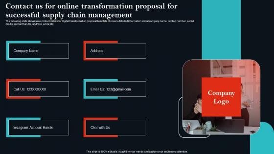 The following slide showcases contact details for digital transformation proposal template. It covers detailed information about company name, contact number, social media account handle, address, email etc. Unleash your creativity with our Contact Us For Online Transformation Proposal For Successful Supply Chain Management Graphics Pdf single-slide PPT template. Whether you are a seasoned presenter or a newbie, our editable and visually-stunning template will make your presentations shine. This template is versatile and easy to use. Make your presentations unforgettable with our premium template and leave a lasting impression on your audience. The following slide showcases contact details for digital transformation proposal template. It covers detailed information about company name, contact number, social media account handle, address, email etc.