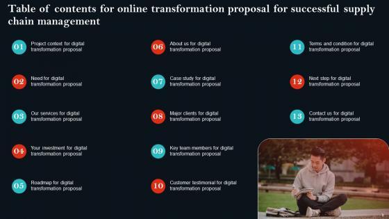 Take your presentations to the next level with our Table Of Contents For Online Transformation Proposal For Successful Supply Chain Management Structure Pdf template. With its sleek design and seamless editing features, this single-slide PPT template is a game-changer for professionals who want to make an impact. Impress your audience with stunning visuals and engaging content that will capture their attention from start to finish. Get your hands on our template and elevate your presentations to new heights. Our Table Of Contents For Online Transformation Proposal For Successful Supply Chain Management Structure Pdf are topically designed to provide an attractive backdrop to any subject. Use them to look like a presentation pro.