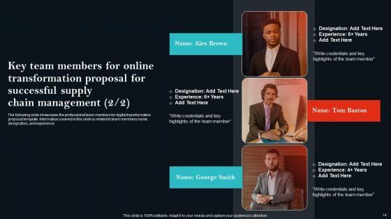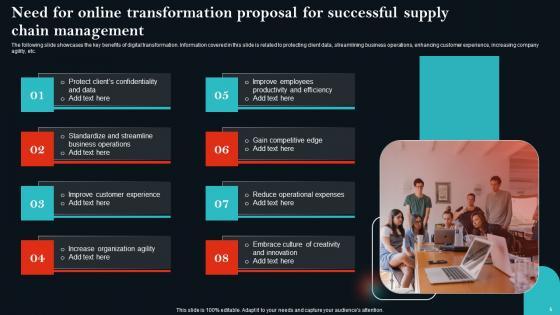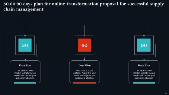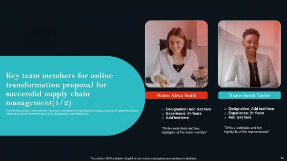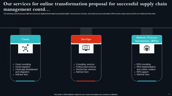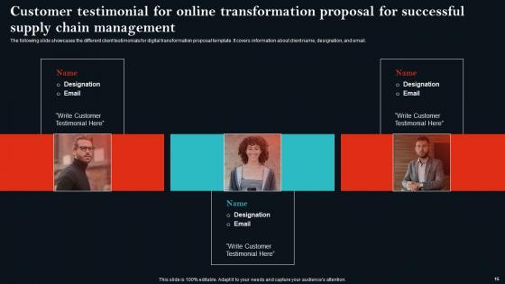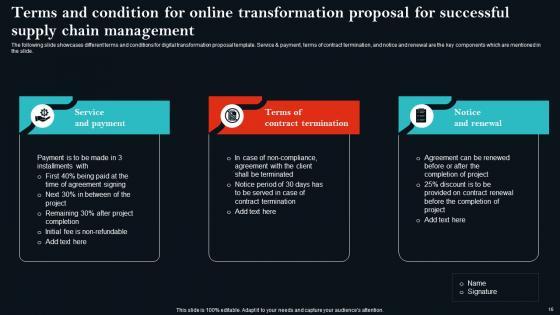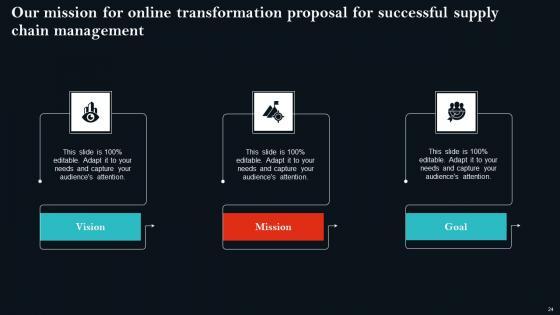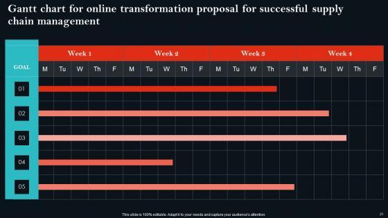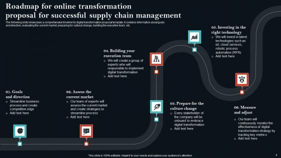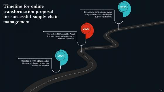 Impress your clients and partners with our Online Transformation Proposal For Successful Supply Chain Management Ppt Powerpoint Presentation Complete Deck. Our 100 percent editable Template is packed with visually-stunning designs that will make your proposals stand out. With easy-to-use features and customizable elements, you can create unique proposals tailored to your specific needs. From business proposals to event proposals, our Template is the perfect tool for creating proposals that win. Our Online Transformation Proposal For Successful Supply Chain Management Ppt Powerpoint Presentation Complete Deck are topically designed to provide an attractive backdrop to any subject. Use them to look like a presentation pro.