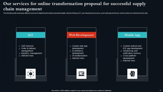 The following slide showcases different services for digital transformation proposal template. Internet of things IoT, web development services, and mobile app are the key services which are mentioned in the slide. Elevate your presentations with our intuitive Our Services For Online Transformation Proposal For Successful Supply Chain Management Template Pdf template. Whether you are delivering a pitch, sharing data, or presenting ideas, our visually-stunning single-slide PPT template is the perfect tool to captivate your audience. With 100 percent editable features and a user-friendly interface, creating professional presentations has never been easier. Download now and leave a lasting impression. The following slide showcases different services for digital transformation proposal template. Internet of things IoT, web development services, and mobile app are the key services which are mentioned in the slide.