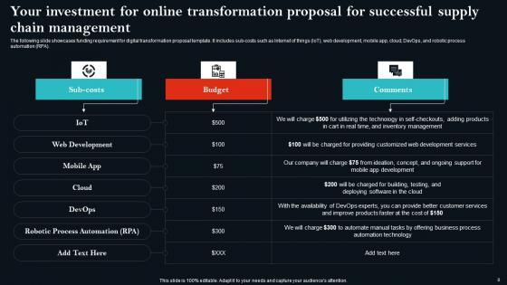 The following slide showcases funding requirement for digital transformation proposal template. It includes sub-costs such as Internet of things IoT, web development, mobile app, cloud, DevOps, and robotic process automation RPA. Elevate your presentations with our intuitive Your Investment For Online Transformation Proposal For Successful Supply Chain Management Diagrams Pdf template. Whether you are delivering a pitch, sharing data, or presenting ideas, our visually-stunning single-slide PPT template is the perfect tool to captivate your audience. With 100 percent editable features and a user-friendly interface, creating professional presentations has never been easier. Download now and leave a lasting impression. The following slide showcases funding requirement for digital transformation proposal template. It includes sub-costs such as Internet of things IoT, web development, mobile app, cloud, DevOps, and robotic process automation RPA.