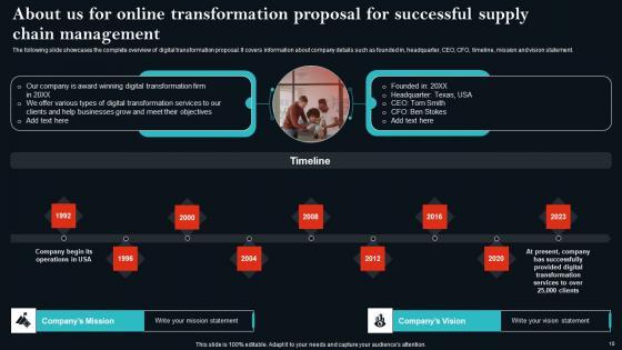 The following slide showcases the complete overview of digital transformation proposal. It covers information about company details such as founded in, headquarter, CEO, CFO, timeline, mission and vision statement. Elevate your presentations with our intuitive About Us For Online Transformation Proposal For Successful Supply Chain Management Elements Pdf template. Whether you are delivering a pitch, sharing data, or presenting ideas, our visually-stunning single-slide PPT template is the perfect tool to captivate your audience. With 100 percent editable features and a user-friendly interface, creating professional presentations has never been easier. Download now and leave a lasting impression. The following slide showcases the complete overview of digital transformation proposal. It covers information about company details such as founded in, headquarter, CEO, CFO, timeline, mission and vision statement.