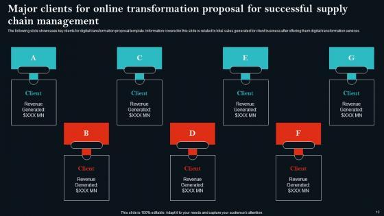 The following slide showcases key clients for digital transformation proposal template. Information covered in this slide is related to total sales generated for client business after offering them digital transformation services. Unleash your creativity with our Major Clients For Online Transformation Proposal For Successful Supply Chain Management Sample Pdf single-slide PPT template. Whether you are a seasoned presenter or a newbie, our editable and visually-stunning template will make your presentations shine. This template is versatile and easy to use. Make your presentations unforgettable with our premium template and leave a lasting impression on your audience. The following slide showcases key clients for digital transformation proposal template. Information covered in this slide is related to total sales generated for client business after offering them digital transformation services.