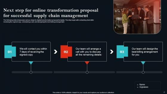 The following slide showcases various steps for digital transformation proposal template. The step begin with contacting client after receiving the signed copy, scheduling a call, and designing the best billing arrangement. Power up your presentations with our Next Step For Online Transformation Proposal For Successful Supply Chain Management Pictures Pdf single-slide PPT template. Our visually-stunning template will help you deliver your message with confidence. With easy-to-use editing options and fully customizable features, you can create polished and captivating presentations in no time. Say goodbye to boring slides and hello to impactful presentations with our top-quality template. Download now and get ready to wow your audience. singles The following slide showcases various steps for digital transformation proposal template. The step begin with contacting client after receiving the signed copy, scheduling a call, and designing the best billing arrangement.