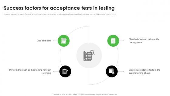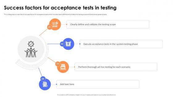 This slide gives an overview of success factors for acceptance tests which include clearly define and validate the testing scope and execute acceptance tests. Here you can discover an assortment of the finest PowerPoint and Google Slides templates. With these templates, you can create presentations for a variety of purposes while simultaneously providing your audience with an eye catching visual experience. Download Success Factors For Acceptance Tests In Testing Acceptance Testing PPT Sample to deliver an impeccable presentation. These templates will make your job of preparing presentations much quicker, yet still, maintain a high level of quality. Slidegeeks has experienced researchers who prepare these templates and write high quality content for you. Later on, you can personalize the content by editing the Success Factors For Acceptance Tests In Testing Acceptance Testing PPT Sample. This slide gives an overview of success factors for acceptance tests which include clearly define and validate the testing scope and execute acceptance tests.