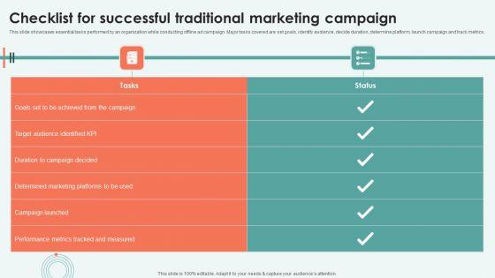This slide showcases essential tasks performed by an organization while conducting offline ad campaign. Major tasks covered are set goals, identify audience, decide duration, determine platform, launch campaign and track metrics. Slidegeeks is one of the best resources for PowerPoint templates. You can download easily and regulate Checklist For Successful Traditional Marketing Campaign Designs PDF for your personal presentations from our wonderful collection. A few clicks is all it takes to discover and get the most relevant and appropriate templates. Use our Templates to add a unique zing and appeal to your presentation and meetings. All the slides are easy to edit and you can use them even for advertisement purposes.