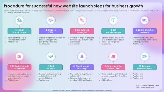 Mentioned slide demonstrates extensive 10 step process for effective new website launch which can be used by businesses to increase online brand presence. It includes steps such as select domain name, choose CMS, execute SEO strategy, set website design, etc. Crafting an eye-catching presentation has never been more straightforward. Let your presentation shine with this tasteful yet straightforward Procedure For Successful New Website Launch Steps For Business Growth template. It offers a minimalistic and classy look that is great for making a statement. The colors have been employed intelligently to add a bit of playfulness while still remaining professional. Construct the ideal Procedure For Successful New Website Launch Steps For Business Growth that effortlessly grabs the attention of your audience Begin now and be certain to wow your customers The slide mentioned demonstrates an extensive 10-step process for an effective new website launch, which businesses can use to increase their online brand presence. It includes steps such as selecting a domain name, choosing a CMS, executing an SEO strategy, and setting a website design.