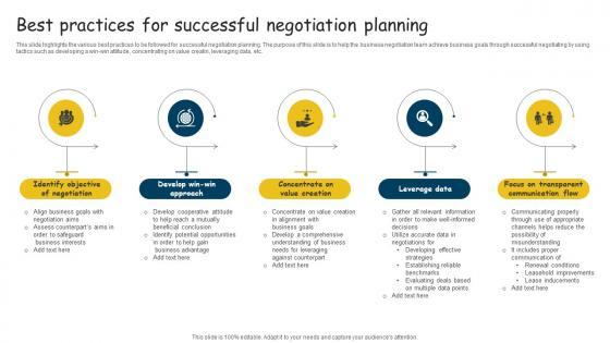 This slide highlights the various best practices to be followed for successful negotiation planning. The purpose of this slide is to help the business negotiation team achieve business goals through successful negotiating by using tactics such as developing a win win attitude, concentrating on value creatin, leveraging data, etc.Pitch your topic with ease and precision using this Best Practices For Successful Negotiation Planning Sample Pdf This layout presents information on Objective Negotiation, Develop Approach, Concentrate Value Creation It is also available for immediate download and adjustment. So, changes can be made in the color, design, graphics or any other component to create a unique layout. This slide highlights the various best practices to be followed for successful negotiation planning. The purpose of this slide is to help the business negotiation team achieve business goals through successful negotiating by using tactics such as developing a win win attitude, concentrating on value creatin, leveraging data, etc.