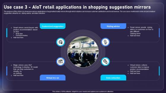 The purpose of this slide is to showcase various applications of augmented reality mirrors through which retailers can increase customer satisfaction and boost revenue. The use cases mentioned in slide are personalized suggestion, virtual try-on, styling advice, and data collection. Take your projects to the next level with our ultimate collection of Use Case 3 AIOT Retail Applications In Shopping Suggestion AIOT Applications For Various Industries IoT SS V. Slidegeeks has designed a range of layouts that are perfect for representing task or activity duration, keeping track of all your deadlines at a glance. Tailor these designs to your exact needs and give them a truly corporate look with your own brand colors they will make your projects stand out from the rest The purpose of this slide is to showcase various applications of augmented reality mirrors through which retailers can increase customer satisfaction and boost revenue. The use cases mentioned in slide are personalized suggestion, virtual try-on, styling advice, and data collection