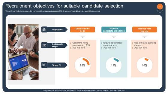 This slide highlights hiring goals set by recruitment team such as decreasing till to fill, cost per hire and improving candidate experience. Do you know about Slidesgeeks Transforming Recruitment Process Recruitment Objectives For Suitable Candidate CRP DK SS These are perfect for delivering any kind od presentation. Using it, create PowerPoint presentations that communicate your ideas and engage audiences. Save time and effort by using our pre-designed presentation templates that are perfect for a wide range of topic. Our vast selection of designs covers a range of styles, from creative to business, and are all highly customizable and easy to edit. Download as a PowerPoint template or use them as Google Slides themes. This slide highlights hiring goals set by recruitment team such as decreasing till to fill, cost per hire and improving candidate experience.