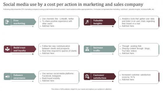 Following slide shows the CPA marketing company is using social media which will assist in reach audience at the appropriate time.. It includes components free marketing, build trust, valuable insights, increase traffic, etc. Pitch your topic with ease and precision using this Social Media Use By A Cost Per Action In Marketing And Sales Company Summary Pdf. This layout presents information on Free Marketing, Enhance Awareness, Increase Traffic. It is also available for immediate download and adjustment. So, changes can be made in the color, design, graphics or any other component to create a unique layout. Following slide shows the CPA marketing company is using social media which will assist in reach audience at the appropriate time.. It includes components free marketing, build trust, valuable insights, increase traffic, etc.