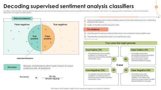 This slide provides information regarding classifiers associated with supervised sentiment analysis by detecting values for parameters that limits error or optimize model fitness. Four cases generated in classification process include true positive, false positive, true negative and false negative. If you are looking for a format to display your unique thoughts, then the professionally designed Decoding Supervised Sentiment Analysis Classifiers Emotionally Intelligent Insights Leveraging AI SS V is the one for you. You can use it as a Google Slides template or a PowerPoint template. Incorporate impressive visuals, symbols, images, and other charts. Modify or reorganize the text boxes as you desire. Experiment with shade schemes and font pairings. Alter, share or cooperate with other people on your work. Download Decoding Supervised Sentiment Analysis Classifiers Emotionally Intelligent Insights Leveraging AI SS V and find out how to give a successful presentation. Present a perfect display to your team and make your presentation unforgettable. This slide provides information regarding classifiers associated with supervised sentiment analysis by detecting values for parameters that limits error or optimize model fitness. Four cases generated in classification process include true positive, false positive, true negative and false negative.