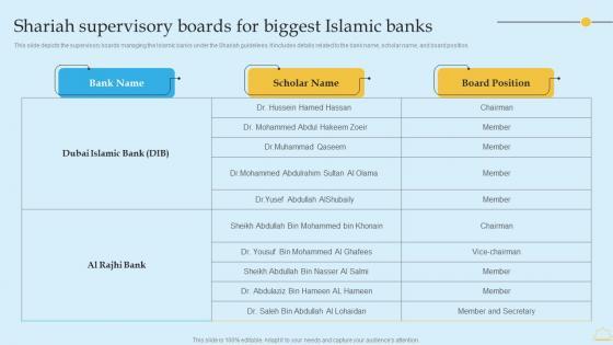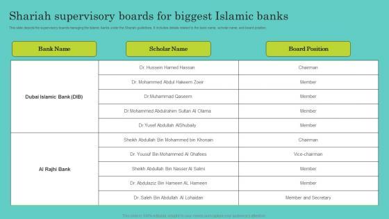 This slide depicts the supervisory boards managing the Islamic banks under the Shariah guidelines. It includes details related to the bank name, scholar name, and board position. Make sure to capture your audiences attention in your business displays with our gratis customizable Shariah Supervisory Boards For Biggest Islamic Comprehensive Guide To Islamic Summary Pdf. These are great for business strategies, office conferences, capital raising or task suggestions. If you desire to acquire more customers for your tech business and ensure they stay satisfied, create your own sales presentation with these plain slides. This slide depicts the supervisory boards managing the Islamic banks under the Shariah guidelines. It includes details related to the bank name, scholar name, and board position.
