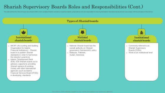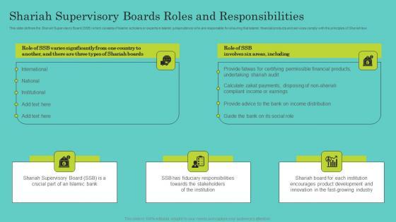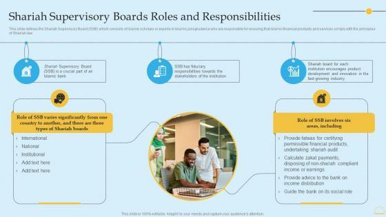 This slide defines the Shariah Supervisory Board SSB which consists of Islamic scholars or experts in Islamic jurisprudence who are responsible for ensuring that Islamic financial products and services comply with the principles of Shariah law. This Shariah Supervisory Boards Roles And Responsibilities In Depth Analysis Of Islamic Banking Inspiration PDF from Slidegeeks makes it easy to present information on your topic with precision. It provides customization options, so you can make changes to the colors, design, graphics, or any other component to create a unique layout. It is also available for immediate download, so you can begin using it right away. Slidegeeks has done good research to ensure that you have everything you need to make your presentation stand out. Make a name out there for a brilliant performance. This slide defines the Shariah Supervisory Board SSB which consists of Islamic scholars or experts in Islamic jurisprudence who are responsible for ensuring that Islamic financial products and services comply with the principles of Shariah law.