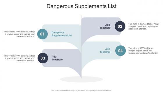 Introducing our well-designed Dangerous Supplements List In Powerpoint And Google Slides Cpb. This PowerPoint design presents information on topics like Dangerous Supplements List. As it is predesigned it helps boost your confidence level. It also makes you a better presenter because of its high-quality content and graphics. This PPT layout can be downloaded and used in different formats like PDF, PNG, and JPG. Not only this, it is available in both Standard Screen and Widescreen aspect ratios for your convenience. Therefore, click on the download button now to persuade and impress your audience. Our Dangerous Supplements List In Powerpoint And Google Slides Cpb are topically designed to provide an attractive backdrop to any subject. Use them to look like a presentation pro.