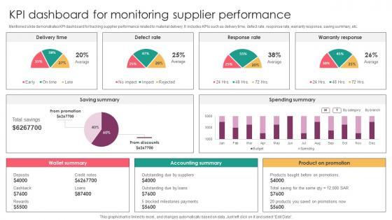 Mentioned slide demonstrates KPI dashboard for tracking supplier performance related to material delivery. It includes KPIs such as delivery time, defect rate, response rate, warranty response, saving summary, etc. Formulating a presentation can take up a lot of effort and time, so the content and message should always be the primary focus. The visuals of the PowerPoint can enhance the presenters message, so our Strategic Supplier Evaluation KPI Dashboard For Monitoring Supplier Performance was created to help save time. Instead of worrying about the design, the presenter can concentrate on the message while our designers work on creating the ideal templates for whatever situation is needed. Slidegeeks has experts for everything from amazing designs to valuable content, we have put everything into Strategic Supplier Evaluation KPI Dashboard For Monitoring Supplier Performance. Mentioned slide demonstrates KPI dashboard for tracking supplier performance related to material delivery. It includes KPIs such as delivery time, defect rate, response rate, warranty response, saving summary, etc.
